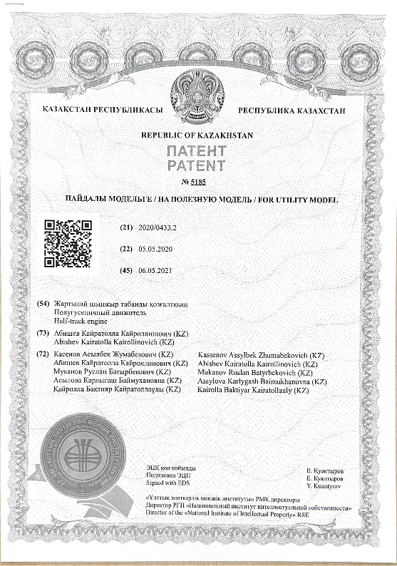 Patent for utility model No. 5185. Semi-tracked propulsion system. Kasanov A.Zh., Abishev K.K., Mukanov R.B., Asylova K.B., Kairolla B.Q. 06.05.2021 |