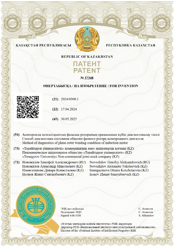 Patent for invention No. 37348. Method for diagnosing the condition of the phase rotor winding of an asynchronous motor. Non-commercial joint-stock company “Toraygyrov University.” Novozhilov T.A., Novozhilov A.N., Imangazinova D.K., Isenov Zh.S. May 30, 2025. |