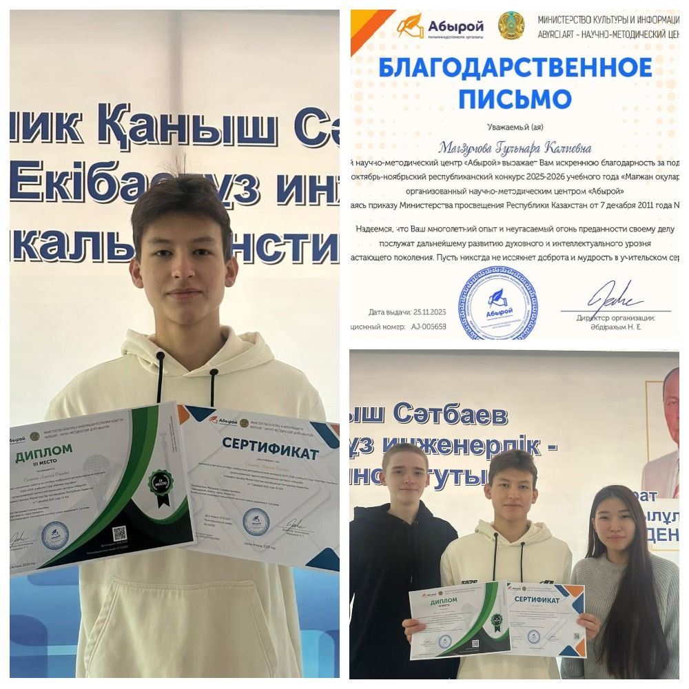 Congratulations to the first-year student of BEE-11, Alexey Semagin, and his supervisor, Gulnara Kaliyevna Magzumova, on the worthy third place in the Republican contest "Magzhan okulary". We wish our winners further creative achievements, inspiration for new victories and continued development in the field of art and literature!