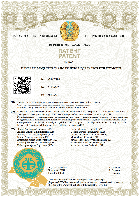 Пайдалы модельге Патент №5743. Тазарту жұмыстарының әсер ету аймағында қазбаны бекіту әдісі. ҚР БҒМ "Қарағанды мемлекеттік техникалық университеті" шаруашылық жүргізу құқығындағы РМК. Демин в. ф., Демина Т. В., Демищук г. в., Мусин Р. А., Қайназарова А. С., Қайназаров А. С., Жұмабеков м. н. 09.04.2021 ж. |
