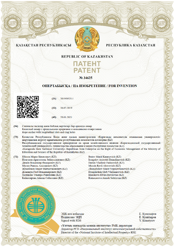 Өнертабысқа Патент №34625. Бойлық ойықтары мен сақиналы тесіктері бар арқан якорь. ҚР БҒМ" Қарағанды мемлекеттік техникалық университеті " шаруашылық жүргізу құқығындағы РМК. Ибатов М. К., Исагулов А. З., Демин в. ф., Демищук г. С., Мусин Р. А., Қайназарова А. С., Халикова э. р., Жұмабеков м. Н. 29.01.2021 ж. |