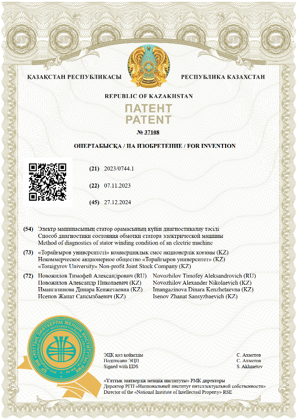 №37108 өнертабысқа Патент. Электр машинасының статор орамасының күйін диагностикалау әдісі. "Торайғыров университеті" коммерциялық емес акционерлік қоғамы. Новожилов Т. А., Новожилов А. Н., Имангазинова Д. К., Исенов Ж. с. 27.12.2024 ж. |