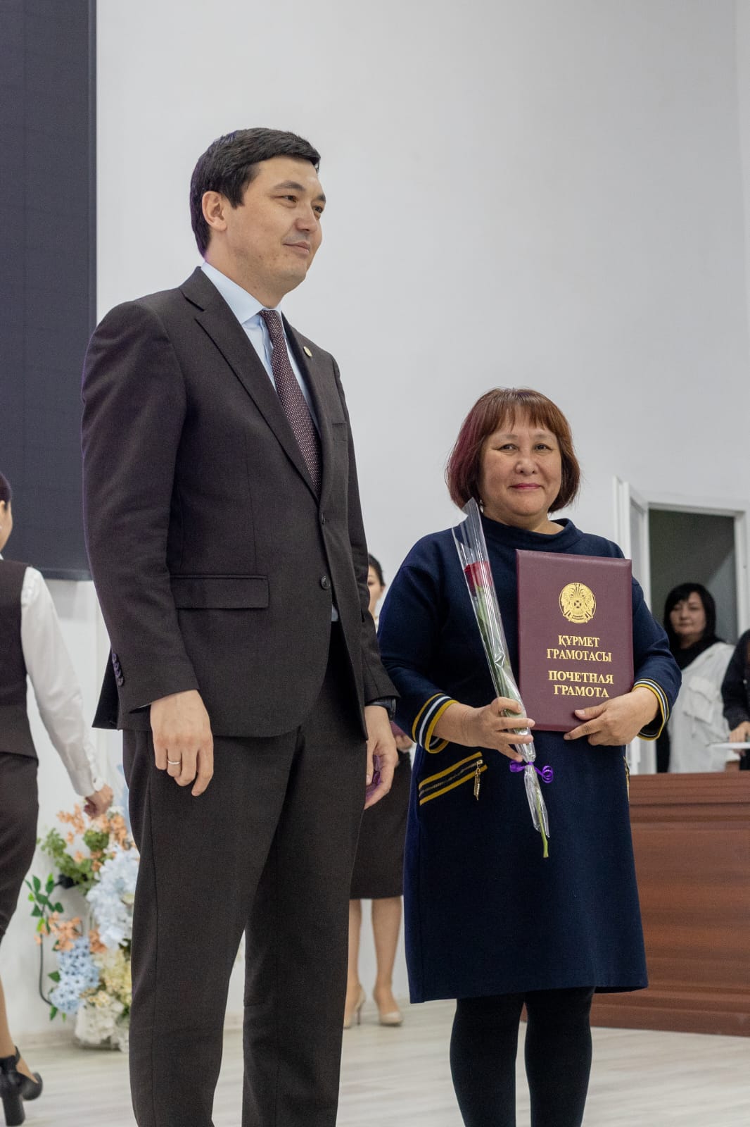 Награждение Почетной грамотой к.х.н доцента кафедры «Металлургии и ЕНД» Макитовой Галии Жумановны акимом города Экибастуз Бейсекиным Аяном Уахитовичем .