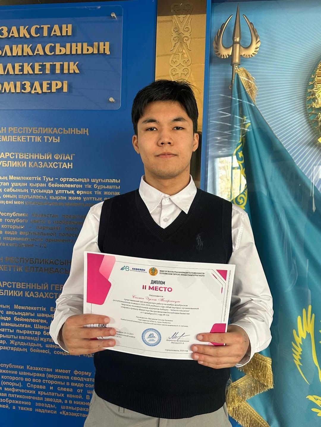 Салман Әділет Темірханұлы студент 1курса БЭ-11 ЕИТИ имени К.Сатпаева занял 2 призовое место республиканском конкурсе 2025-2026 учебного года «Абай оқулары» Акберен - «Akberen Education» по приказу Министерства просвещения РК